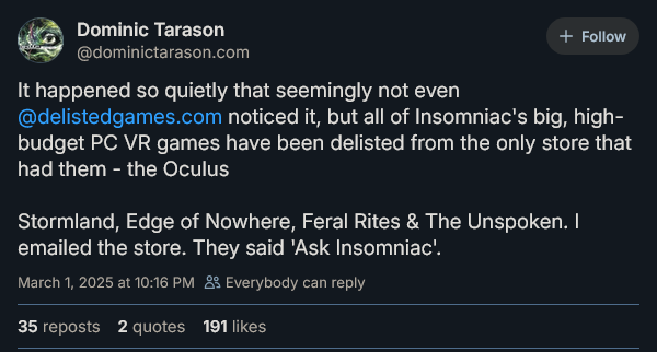 根据重制版工作室负责人 Stephen Kick 在Bluesky 上发布的一篇文章,该游戏的“Oculus 版”VR 版本已被取消。