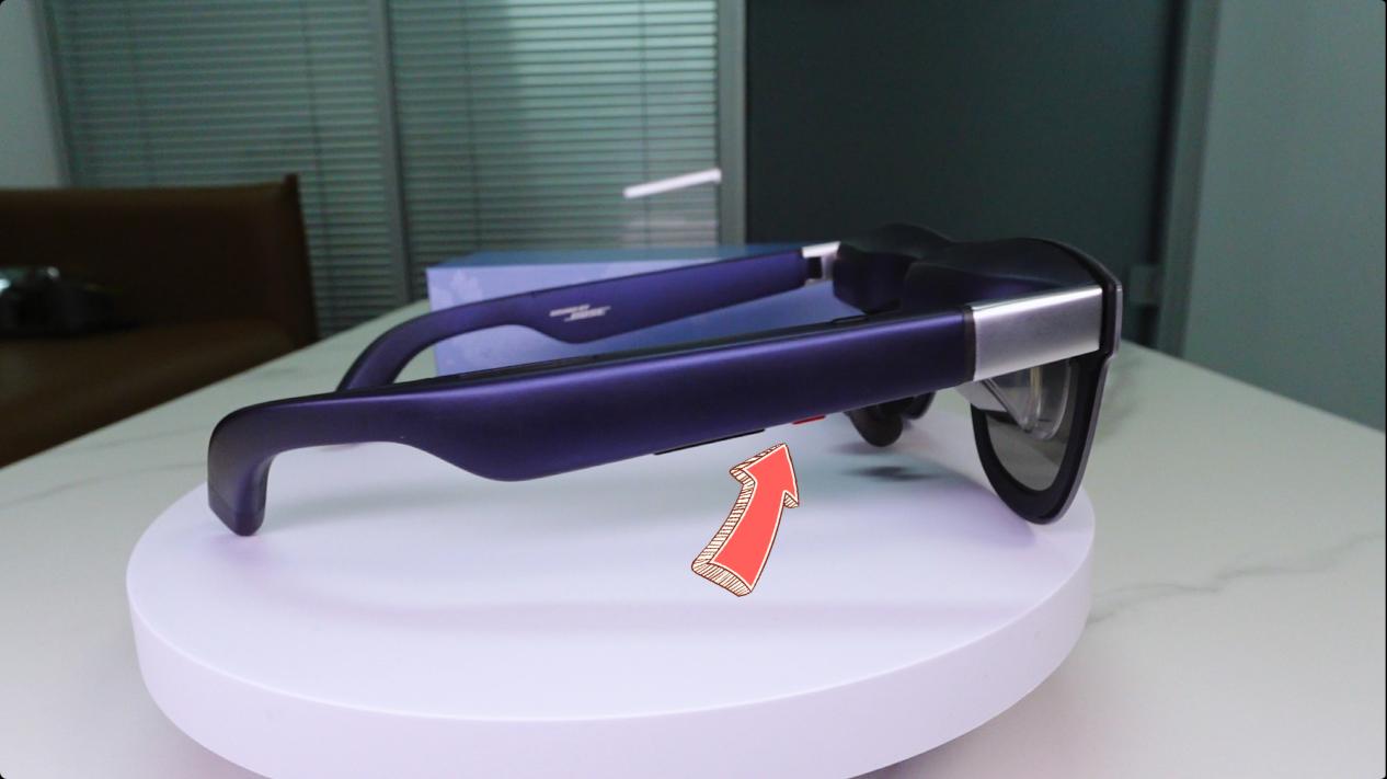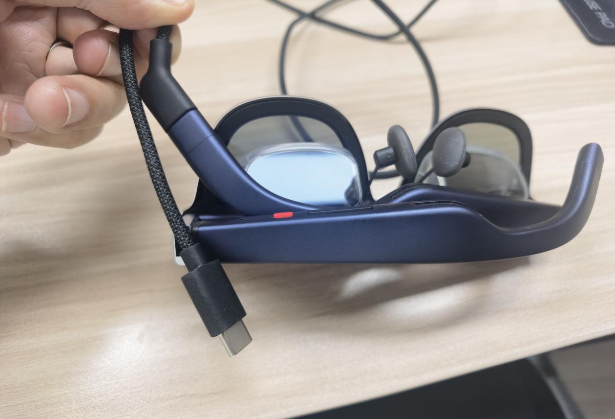 机身唯一的物理接口是Type-C,用于连接和供电。右侧镜腿集成了亮度调节和功能切换的触控区,还有一个多功能按键,用于呼出菜单并进行详细设置——这个设计至关重要,意味着所有核心功能调节都独立于外部设备。