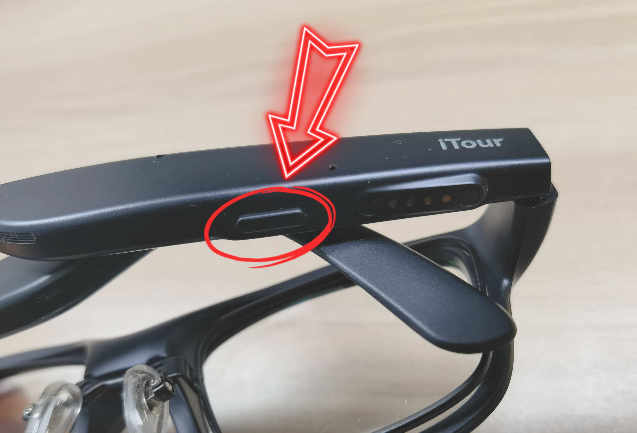 外形设计方面,iTour A1两眼中间的部位比较厚重,应该是集中了光机,这样才能在镜片里显示文字。镜腿戴起来感觉并不夹头,镜腿后端配有防滑垫,不容易滑落,这个设计加分。