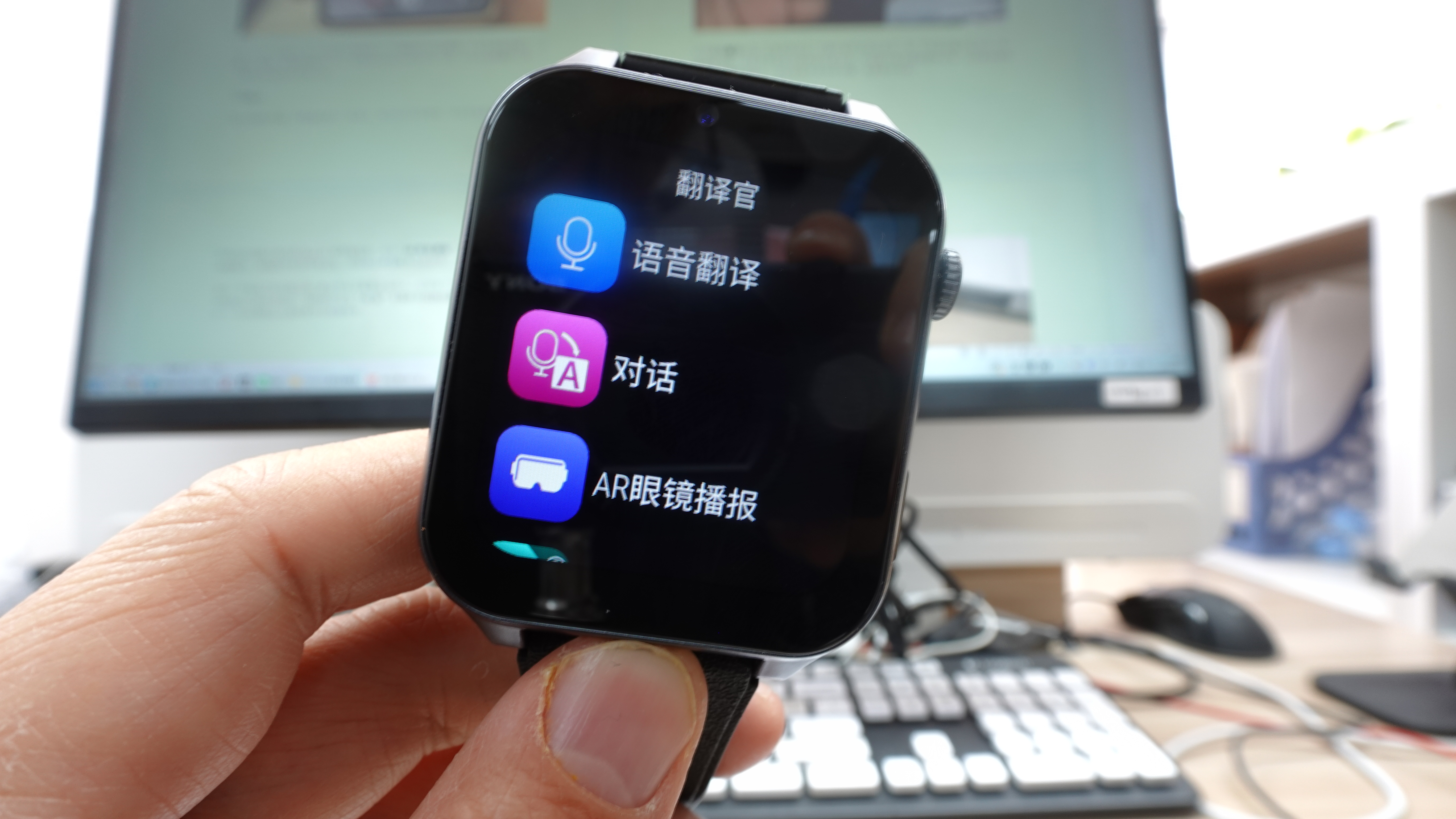 我们手上除了iTour A1 AR眼镜,还有亲爱的翻译官出品的翻译手表,价格在1000元左右。手表里有个“翻译官”应用,点进去就能看到语音翻译、对话翻译、离线翻译等,试试效果如何吧!