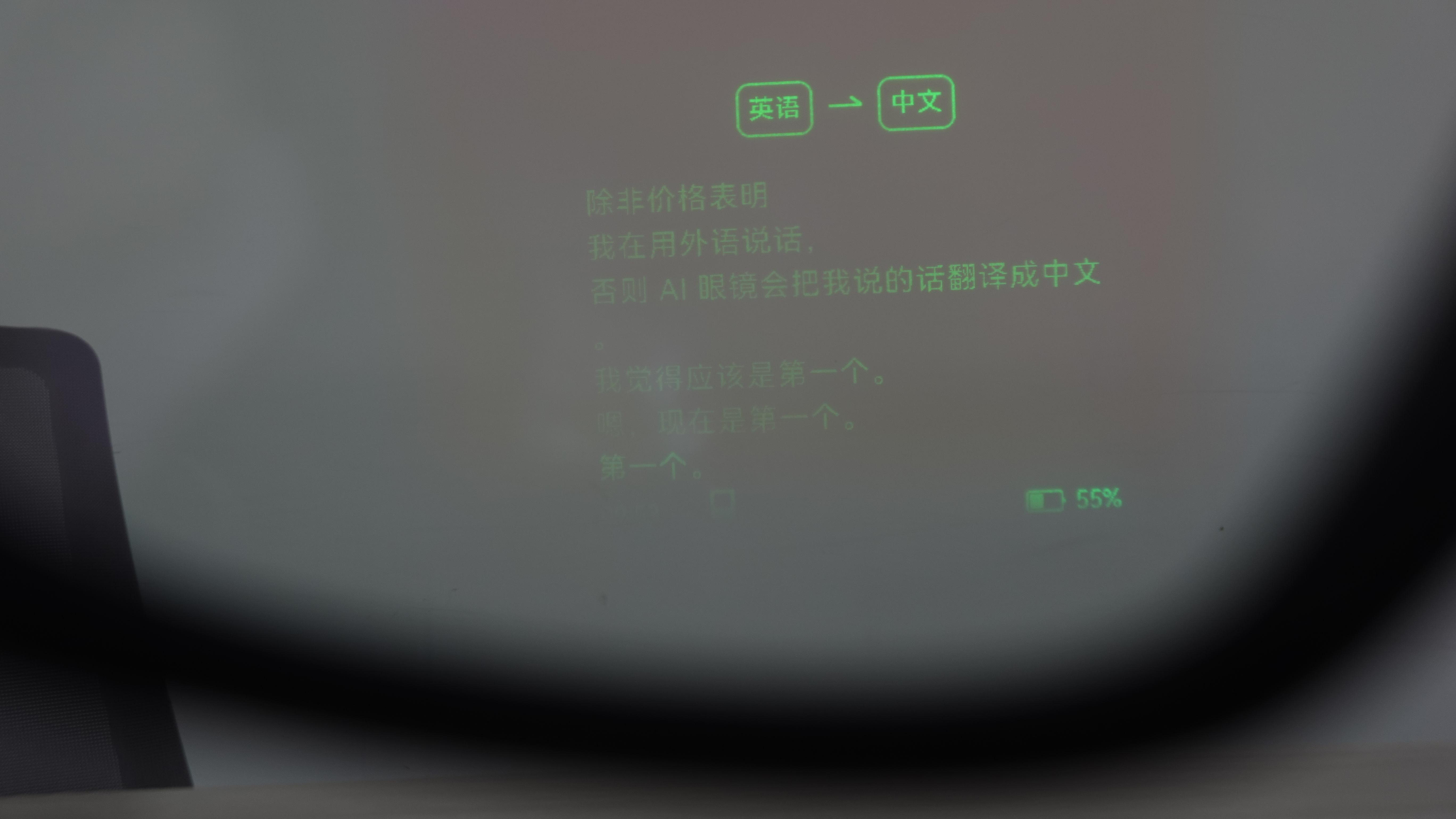 这是最简单的模式:AI会识别你正在说的话,并把它转成实时字幕显示在眼镜里,但不会翻译成另一种语言,总之是你说什么它就显示什么。