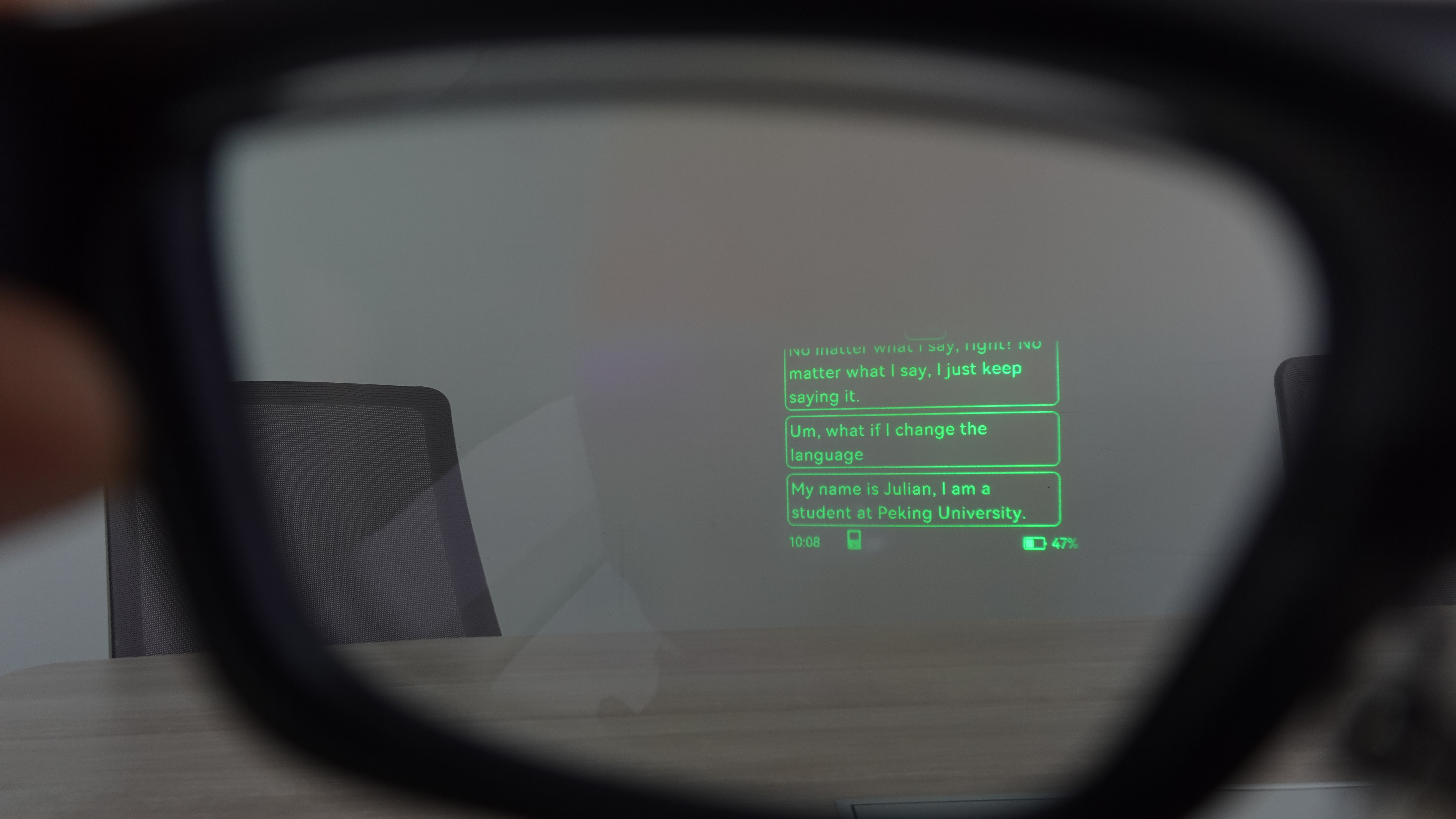 具体的操作是:APP端可以选择两种语言,比如我右边选择了中文,那么无论收音设备听到了什么外语,它统一都会翻译成中文,在眼镜端显示给我看(如下图),同时播报给我听。这里的好处是不固定语言,哪怕对方瞬间切换别的外语,最后的翻译结果都是中文,这就很方便。