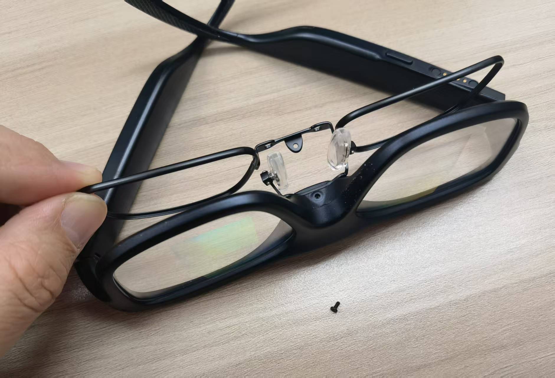 iTour A1上手的第一感觉是轻,实测上称重量只有44克,比它看起来要轻很多,尚未达到眼镜行业的“50克生死线”。对于近视人士,产品的包装里还贴心地赠送了一个近视镜金属框架和一些螺丝。