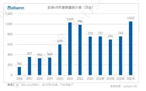 维深信息wellsenn XR预测,由于尚未看到其他厂商有拉动销量的产品出现,加上预计Meta缺乏新品发售,2025年全球VR的销量有望跌破700万台。