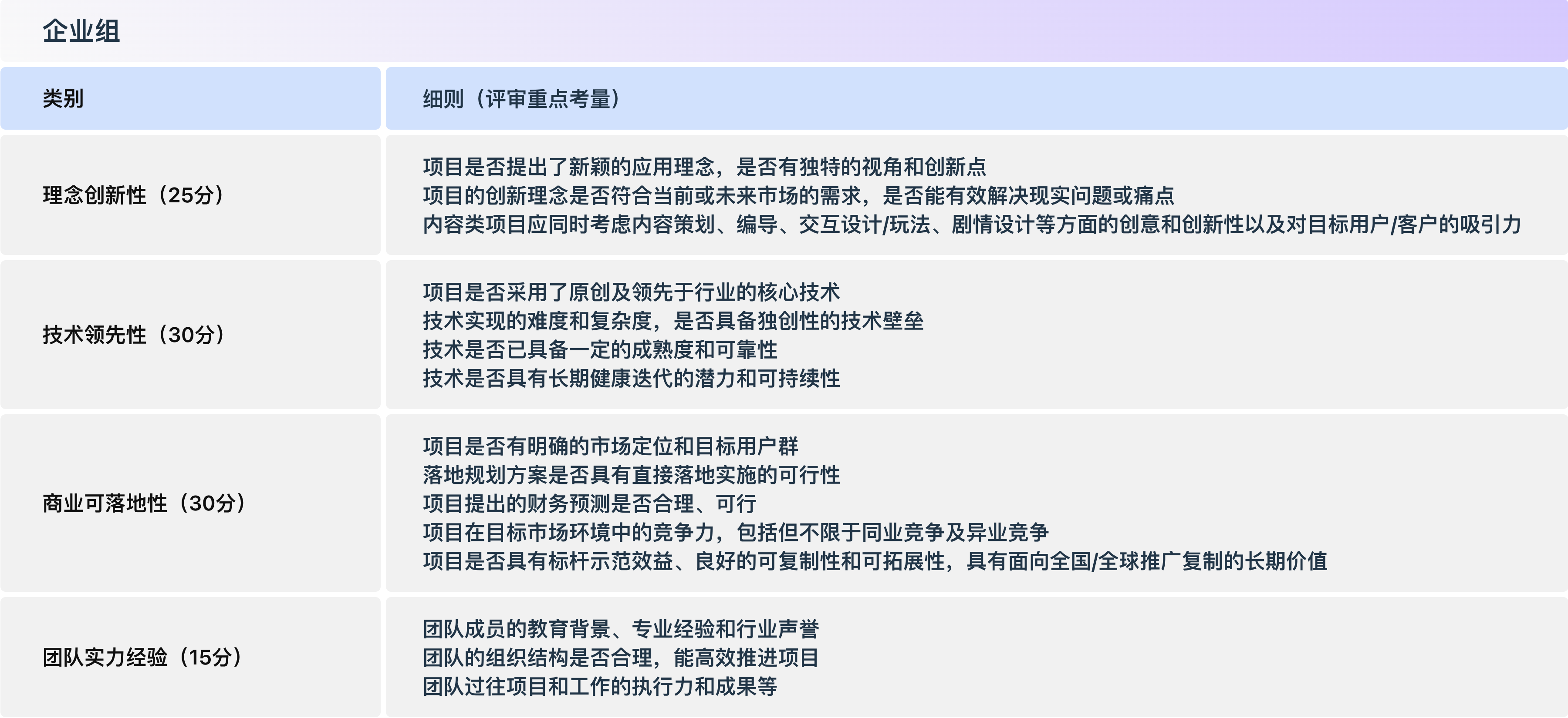 为了确保大赛的公平性与专业性,本次比赛采用了严格的评选规则和流程。参赛作品需经过技术表现、创意创新、市场潜力等多维度的综合评审,最终选出24强优秀项目,评选流程如下(评选打分标准见文末):
