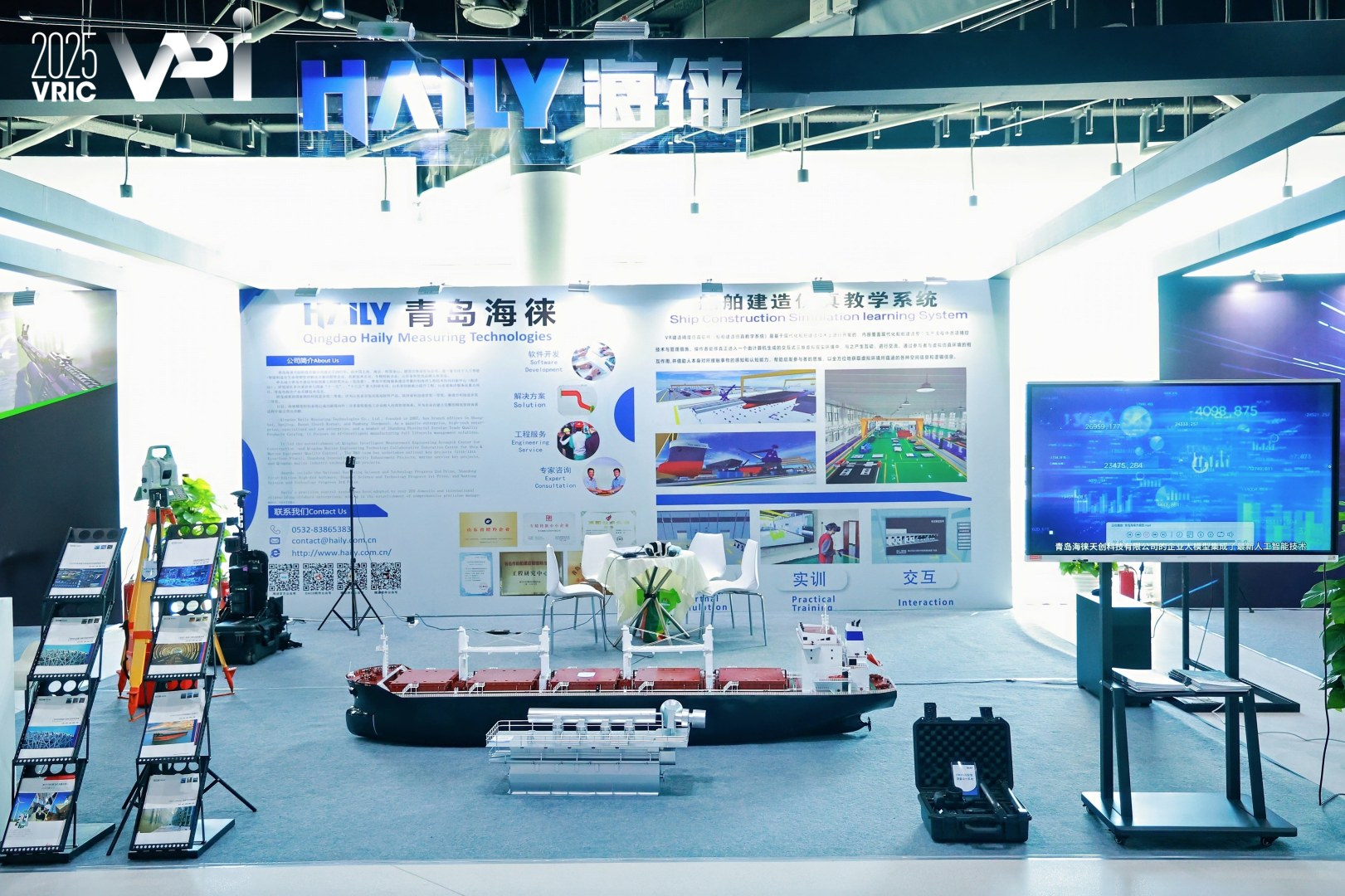 现场体验中,海徕天创展示了其自研的VR建造精度仿真教学系统。通过VR设备进入虚拟船坞,可在三维空间中自由漫游,观看造船流程演示,并进行精度策划与安全训练等操作。系统结合虚拟现实与数字孪生技术,交互感强、场景真实,支持多设备接入,已在多所院校和船舶企业投入使用,用于技能教学与专业培训。