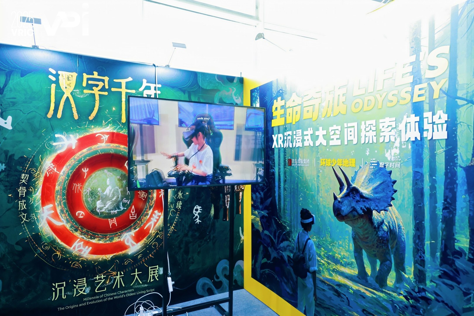 现场,数字时间展示了其以XR影片与沉浸式展陈为核心的数字文旅内容。其中《生命奇旅》作为代表项目,通过空中飞行、穿越丛林、与各类恐龙近距离相遇等场景,让观众直观了解恐龙的生活状态与习性,非常适合青少年科普体验。依托丰富的文化版权和数字内容研发能力,数字时间将XR、AI等技术应用于科普教育与文旅文博场景,推动传统空间的数字化升级。