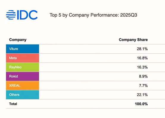 IDC 数据显示,VITURE 以近三分之一市场份额拿下 2025 年 Q3 美国 AR 市场销量冠军。根据亚马逊官方数据,2025年上市的 VITURE Luma 系列 XR 眼镜畅销全球,包揽日本、德国、法国、西班牙、意大利、沙特阿拉伯等 欧亚 10 国亚马逊 AR 眼镜 Best Sellers。2026年,随着拥有全球最大视场角(FOV 58)和内置原生3DoF 的VITURE Beast XR 眼镜上市,VITURE在2026年将进一步巩固其“全球消费者首选 XR 品牌”的地位。