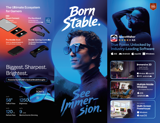 今年,VITURE 全球首发 AI 2D 转 3D 技术,广受赞誉。该技术基于 自研 3D 算法与 XR 硬件的深度融合,为VITURE Beast 的174英寸巨幕解锁 2D 内容实时转化为 3D 画面。凭借这一创新,VITURE 为用户带来前所未有的超沉浸式体验——无论是工作效率、影音娱乐,还是游戏互动,AI 超沉浸 3D 技术 正在彻底重塑用户与数字内容的交互方式。