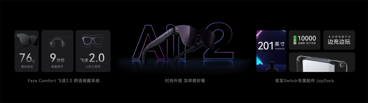 此外,会上还发布了索尼最新一代MicroOLED 屏幕的雷鸟Air 2,带来6米距离等效201英寸的高清巨幕,最大入眼亮600nits,支持 60/120Hz 两档刷新率,整机重量较前代产品降低12.6%,画面更清晰,佩戴更舒适。随雷鸟Air 2发布的JoyDock是行业首款Switch专属XR眼镜配件,无需繁琐的接线,即插即用,可为Switch供电、支持边充边玩,提供更震撼更沉浸的Switch随身游戏巨幕。