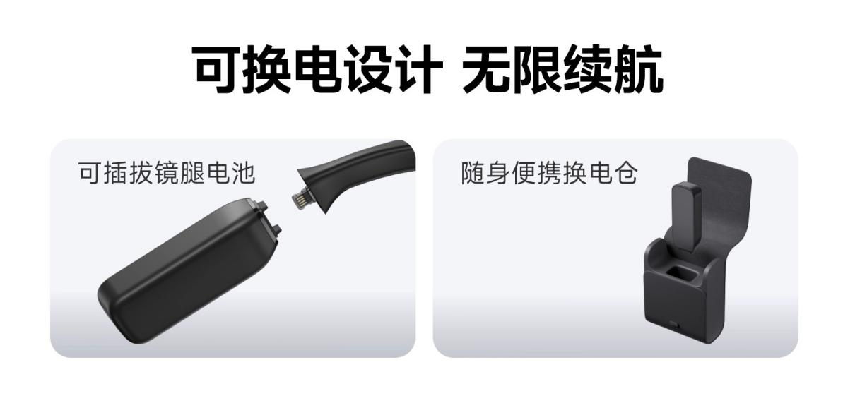 l 续航设计有点巧思:它采用双电池+可换电设计,镜腿一拔就能换主电池,换电时副电池还能接着供电。配合换电仓,基本实现“全天不断电”。