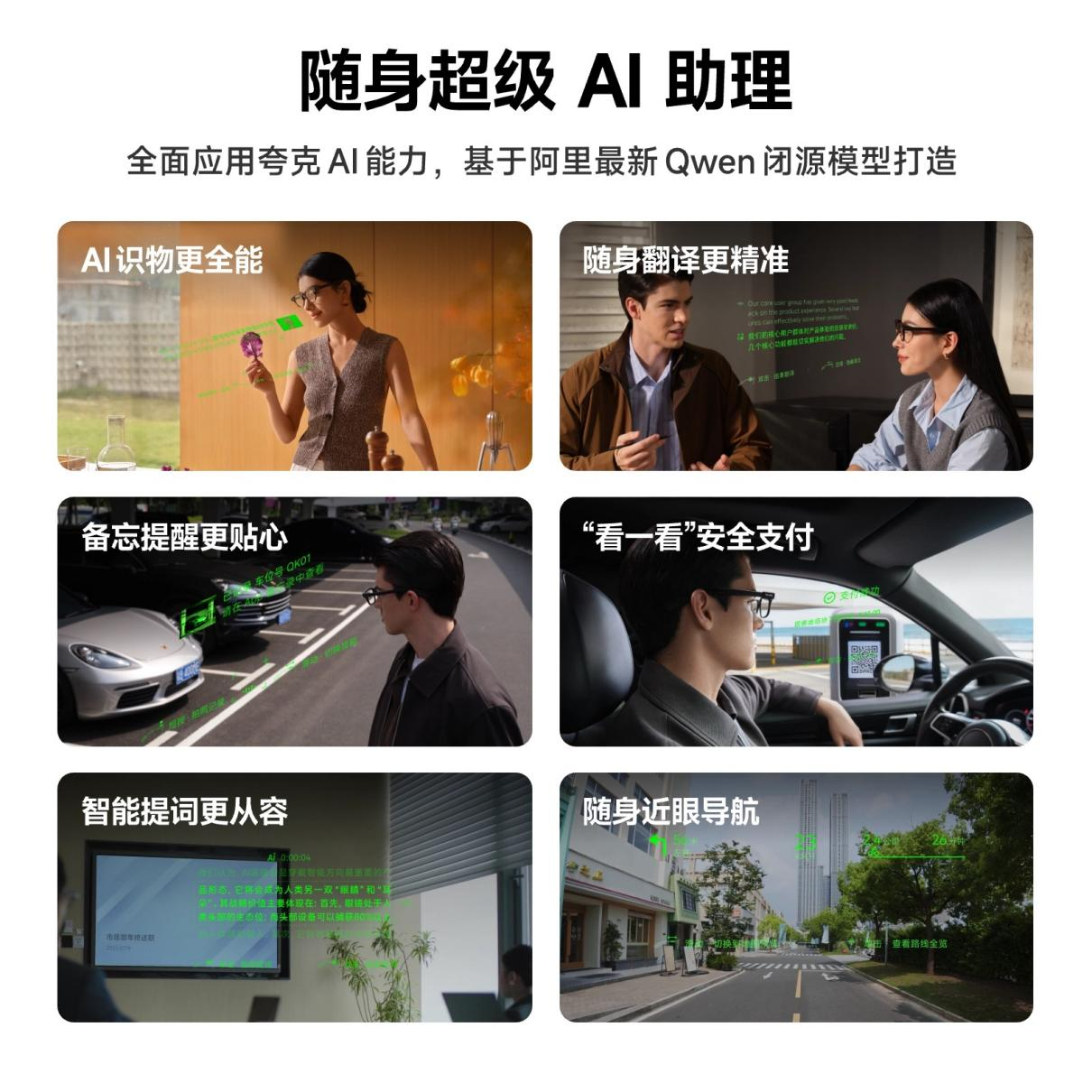 l 这点也是核心卖点:AI 助理能力全面。夸克 AI 眼镜深度融合了夸克大模型,基于阿里最新的 Qwen 闭源模型打造出一个“超级 AI 随身助理”。不管是日常问答、工具调用,还是出行、购物、支付等生活场景,它都能做到实时响应、自然交互。