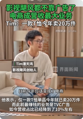 在今年10月的一档访谈节目中,Tim公开表示,目前电商已是影视飓风"最赚钱的业务",而此前最赚钱的TVC广告营收占比已大幅下降,仅占10%左右。