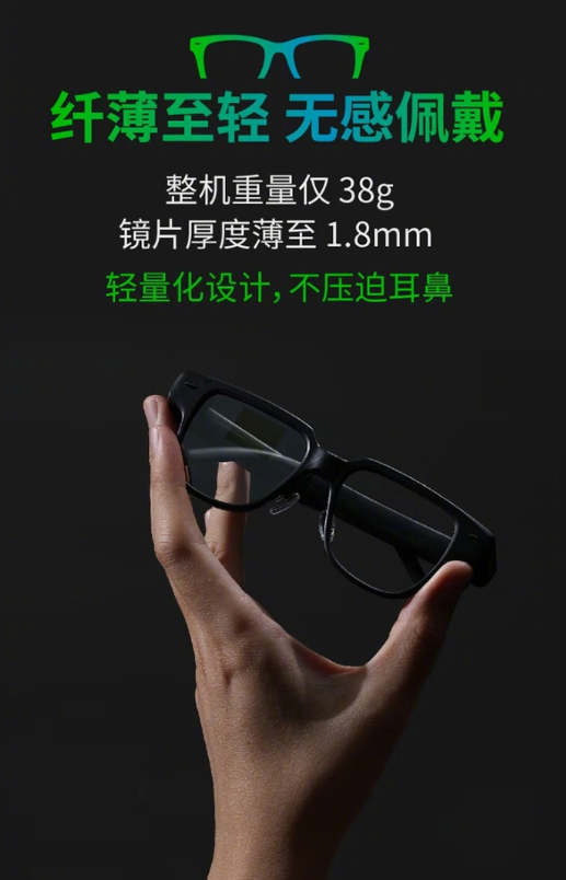 这款眼镜主打轻量化设计,整机仅重38g,镜腿末端做得比较细,佩戴起来负担感小。它没有沿用市面上常见的玻璃光波导方案,而是采用了莫界科技的树脂衍射光波导技术,镜片厚度薄至1.8mm,整体更轻更贴脸。