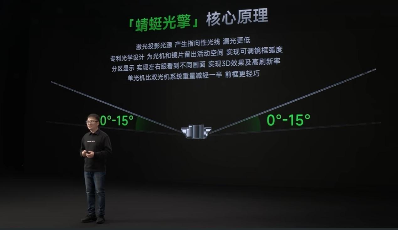 “蜻蜓光擎”采用激光投影光源,产生指向性光线,漏光更低。其专利光学设计为光机和镜片留出活动空间,实现可调镜框弧度(0°-15°)。分区显示技术使左右眼能看到不同画面,实现3D效果及高刷新率。