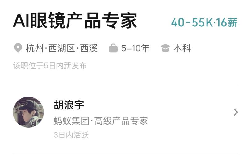 关于这一内容,其实也早有相关消息爆料。早在去年3月,就有Boss直聘上一则招聘信息显示,蚂蚁集团正在招聘AI智能眼镜产品专家。