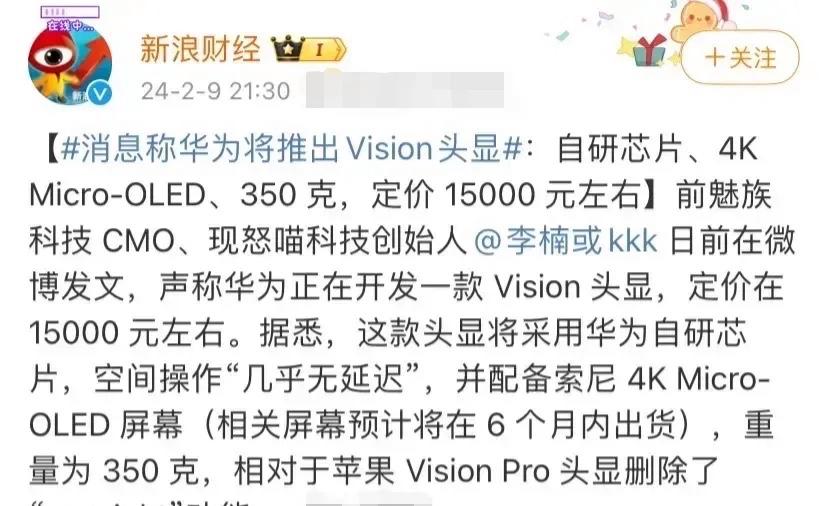 经过消息查证,2024年确实有爆料称华为即将推出一款名为“Vision”的头显,采用华为自研的芯片,配备索尼4K Micro OLED屏幕,重量仅有350克,定价15000元左右。