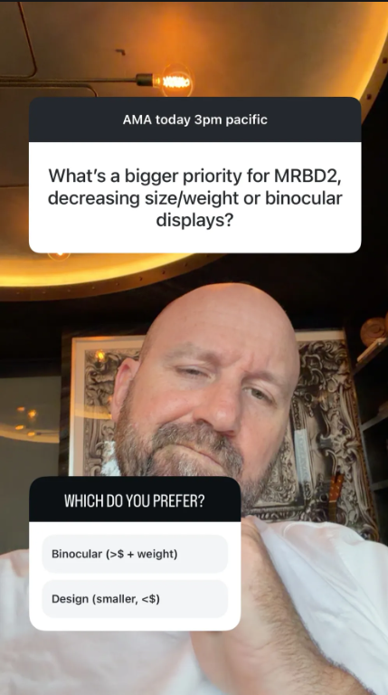 当粉丝在 Instagram 上询问:“下一代产品,你们是优先做更小更轻,还是增加一个显示屏?”博斯沃思没有直接回答,而是发起了一项意味深长的投票: