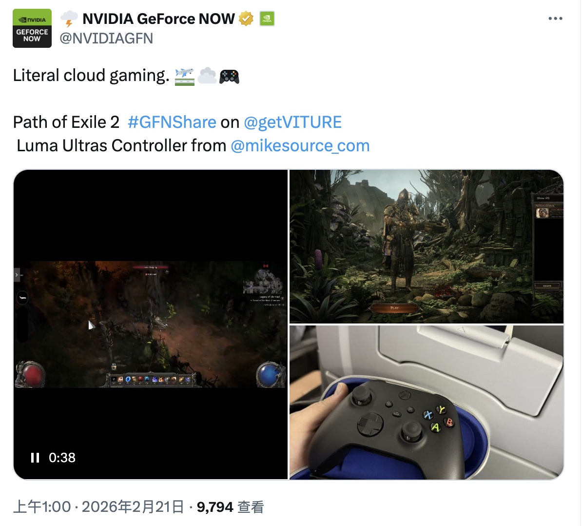 此前,用户在飞机上通过VITURE XR眼镜与GeForce NOW服务体验ARPG游戏《流放之路2》