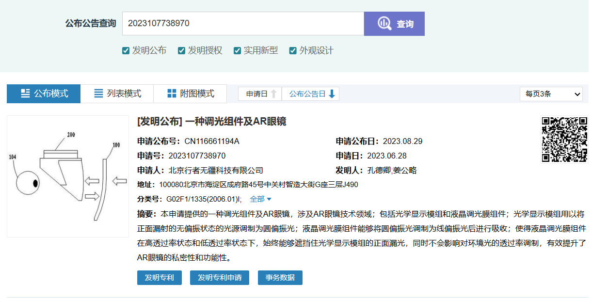2024年8月,VITURE又获得了“一种调光组件及AR眼镜”发明专利授权,专利号202310773897.0。