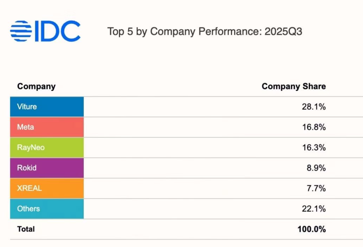 目前,虽然智能眼镜看似火爆,但若跳出行业视角,整个AR眼镜行业仍处在快速发展与市场培育的初期。根据市场研究机构IDC发布的2025年第三季度美国AR市场数据显示,VITURE和XREAL都排在前列,这也反映出中国AR企业在全球市场已具备一定的竞争力。