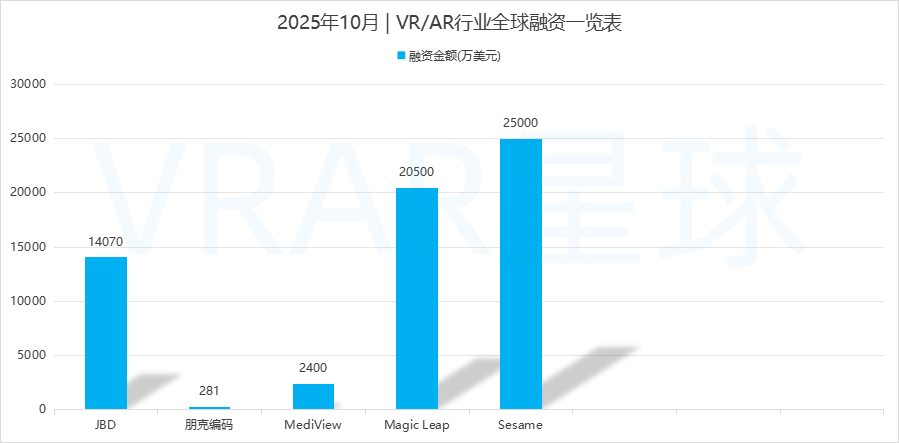 据 VRAR星球 不完全统计,2025 年 10 月,全球 VR/AR 领域共发生 7 起融资事件,披露融资数额约 6.2251亿美元(约合44.23 亿人民币,按1美元≈7.11人民币汇率估算)。