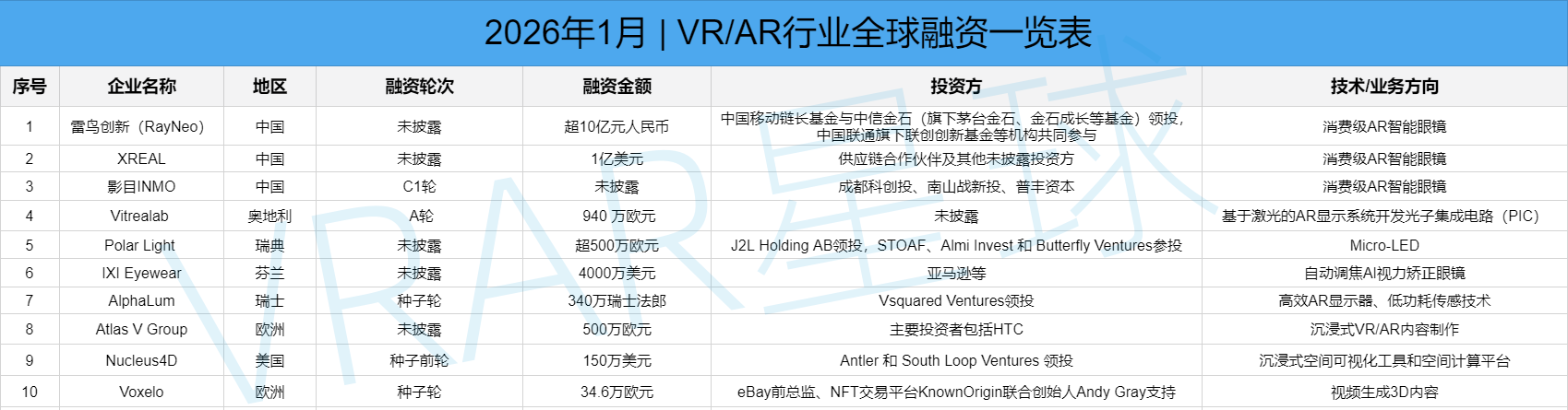 硬件供应链是融资热点:JBD 和理湃光晶都集中在 AR 眼镜的核心硬件部件领域,这反映出,随着 AI 与 AR 融合趋势加强,行业正致力于攻克显示、光学等关键技术,为消费级 AR 眼镜的轻量化和大规模普及铺路。也表现出机构投资者也看好 AR 眼镜作为 AI 时代核心交互终端的潜力。