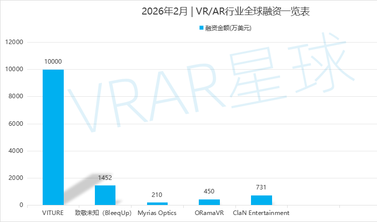 据 VRAR星球 不完全统计,2026 年2月,全球 VR/AR 领域共发生 7 起融资事件,披露融资数额约 1.2842 亿美元(约合 8.85 亿人民币,按1美元≈6.89人民币汇率估算)。