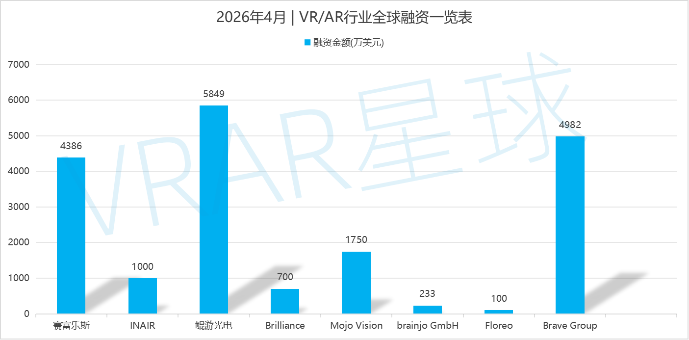 据 VRAR星球 不完全统计,2026 年 4 月,全球 VR/AR 领域共发生 9 起融资事件,披露融资数额约 1.9 亿美元(约合 13 亿人民币,按1美元≈6.84人民币汇率估算)。