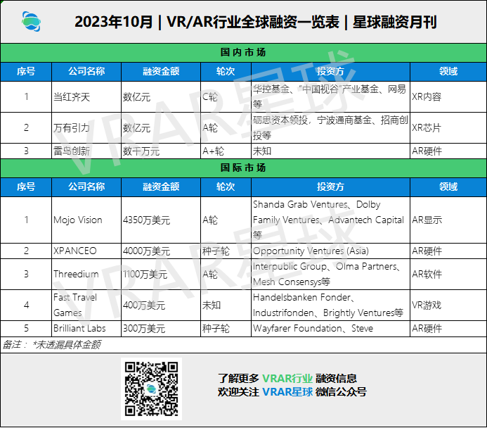 闲话少说,本期的VRAR星球带您来看一下10月各大VR/AR企业具体的融资情况。另外,文末有融资汇总一览表,欢迎拖到文章最后查看。