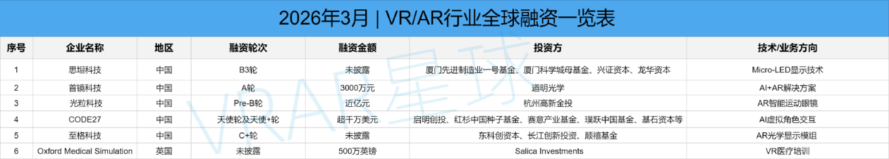 据 VRAR星球 不完全统计,2025 年 9 月,全球 VR/AR 领域共发生 6 起融资事件,披露融资数额约 2.172 亿美元(约合15.46亿人民币,按1美元≈7.12人民币汇率估算)。
