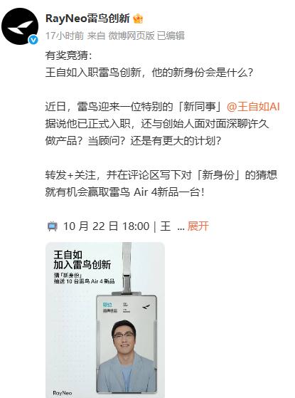 10月23日,雷鸟将举行新品发布会,雷鸟Air4将正式亮相。