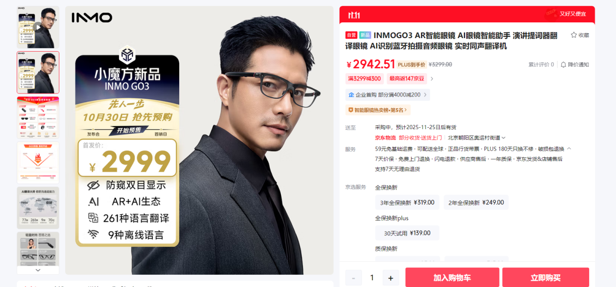 影目 INMO GO3 智能眼镜已在京东开售