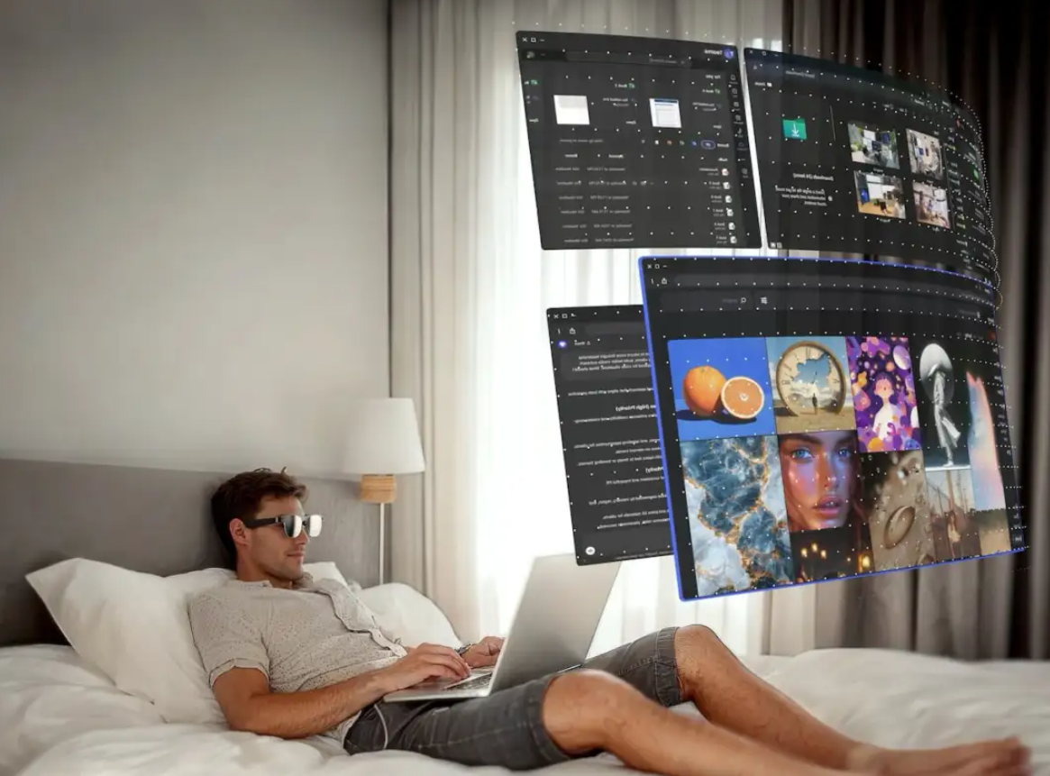 Spacetop for Windows 将笔记本电脑的熟悉功能与 AR 的自由体验融为一体。用户可以在超过 100 英寸的空间画布上随意放置应用程序:消息应用程序放在侧面,巨型电子表格放在正中央,文档则垂直拉伸,同时还能完全保护隐私。
