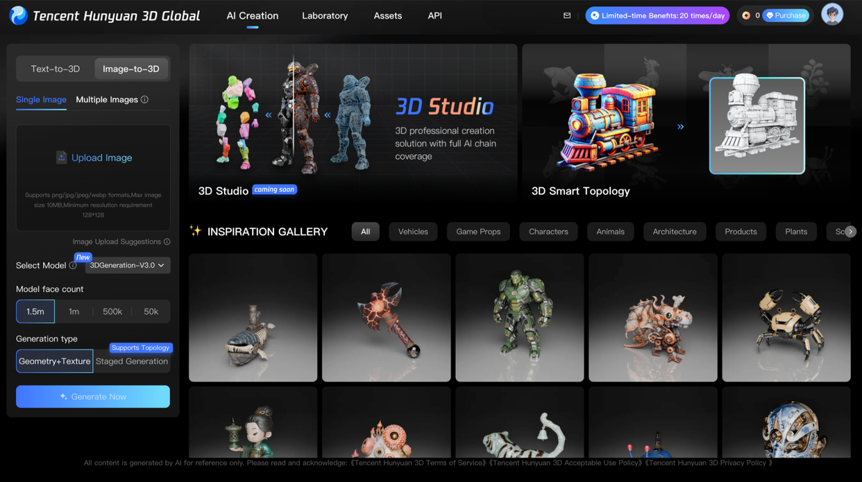 混元3D AI创作引擎全面更新至v2.5模型底座,同时免费生成额度翻倍,提升至每天20次。混元3D生成API也已正式上线腾讯云,面向企业和开发者开放。