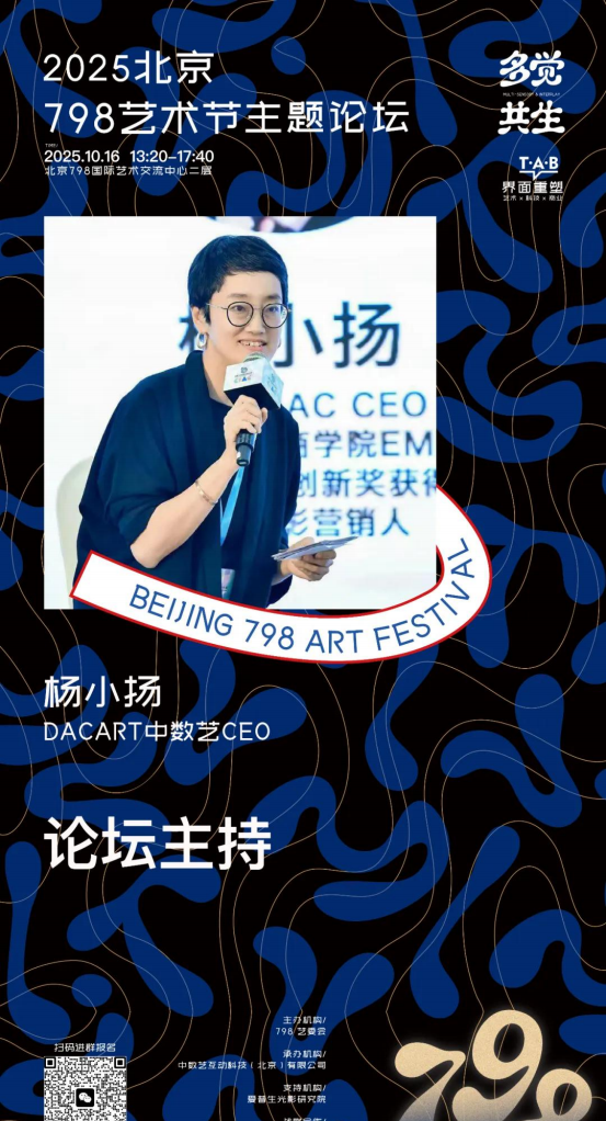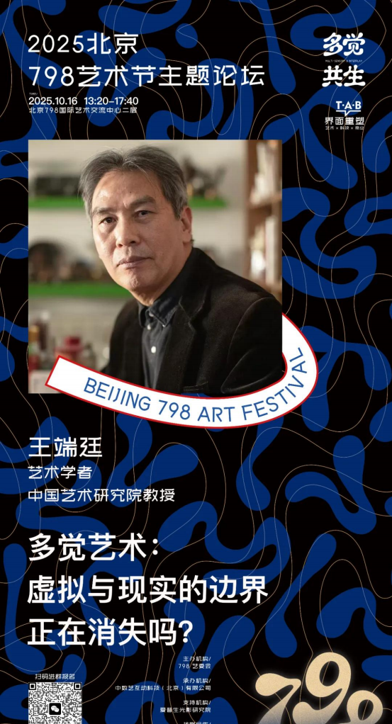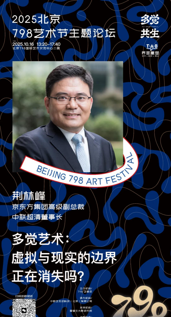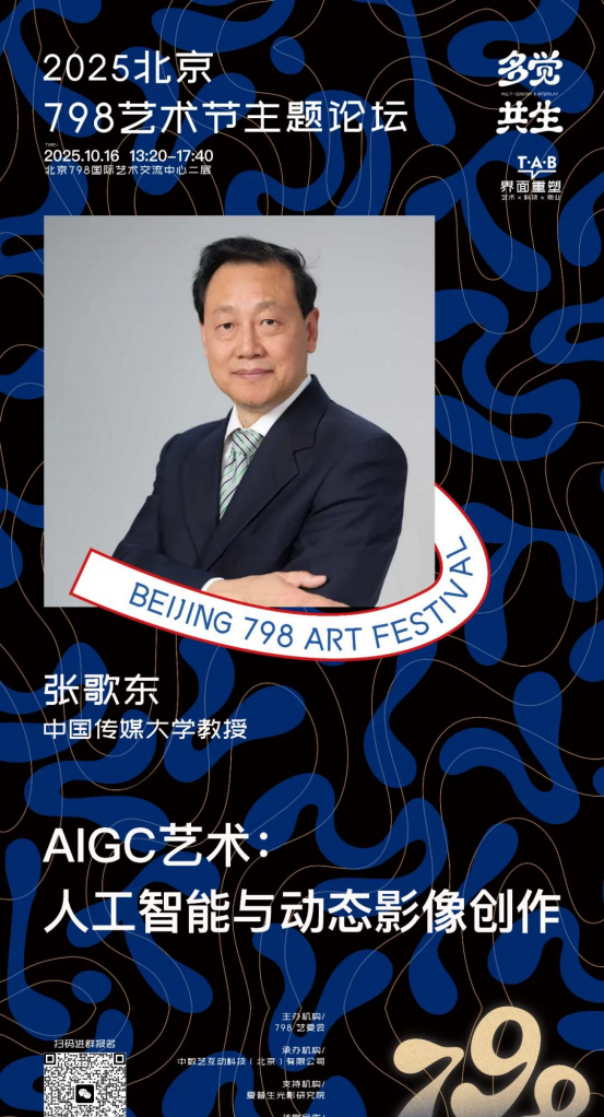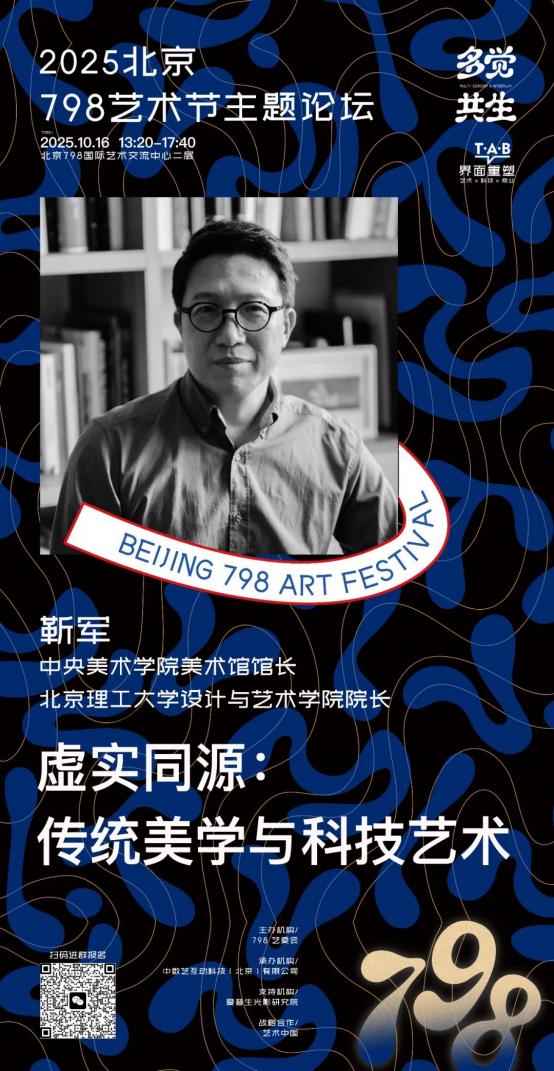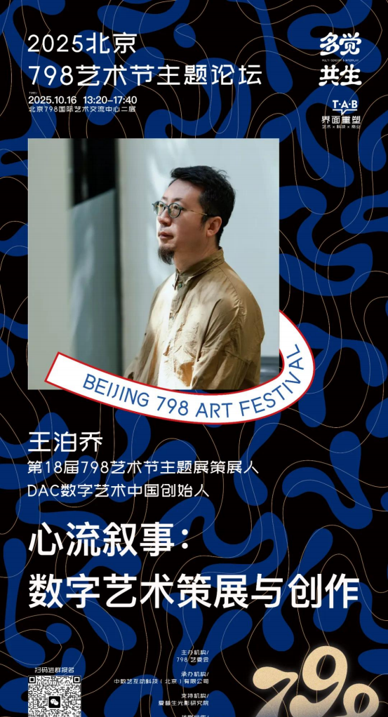 作为艺术节的核心活动单元之一 ,T.A. B 论坛是由数字艺术中国( DAC 中数艺) 发起 , 旨在构建科技( Technology) 、艺术( Art) 与商业( Business) 之间的跨界交流平台 。聚焦技术进步对艺术创作 、策展与产业结构的推动 ,探讨数字艺术在文化叙事 、感官体验与价值体系中的再定义 ,为当代创作者 、研究者与产业参与者提供多维度的思考视角与实践参照 。 自创办以来, T.A. B 论坛以开放 、 前瞻和实践为导向 , 汇聚了艺术家 、 学者 、 工程师 、 企业家等多领域思想者 , 探讨数字艺术在文化遗产 、 商业生态和社会创新中的新可能 。 本届论坛作为第 18届 798 艺术节主论坛 ,将继续聚焦 “ 艺术 × 科技 × 商业 ” 的深度融合与未来走向 , 呈现当代艺术节语境中最具启发性的跨界思想与案例。