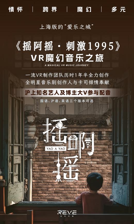 作为全球首部VR魔幻音乐剧,《摇阿摇·刺激1995》选择以现实主义题材,聚焦 1995 年的上海 。以成年阿尼头的怀旧独白为引,借1995年地铁车票带领观众穿越回老静安石库门“春风里”弄堂内。10岁的阿尼头在夜晚帮嗲妹妹寻找猫咪“香菜”,串联起一群年轻人的时代群像:众人的故事在地铁车厢、老静安石库门弄堂、人民广场大屏幕、苏河湾等场景间流转,那个年代特有的生活细节,都在虚拟现实空间中得以精准还原,共同构成了90年代大上海的温热记忆。