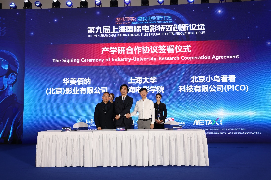 10 月 25 日论坛现场,上海电影学院与华美佰纳(北京)影业有限公司、北京小鸟看看科技有限公司(PICO)签署产学研三方战略合作协议。三方将整合各自优势资源,聚焦大空间电影的学术研究、技术研发、内容创作与产业应用,计划推出多个示范性项目,一方面让学生直接参与从创意到制作的全流程,强化实践能力培养;另一方面面向行业开放合作平台,搭建学术研究与产业实践的桥梁。