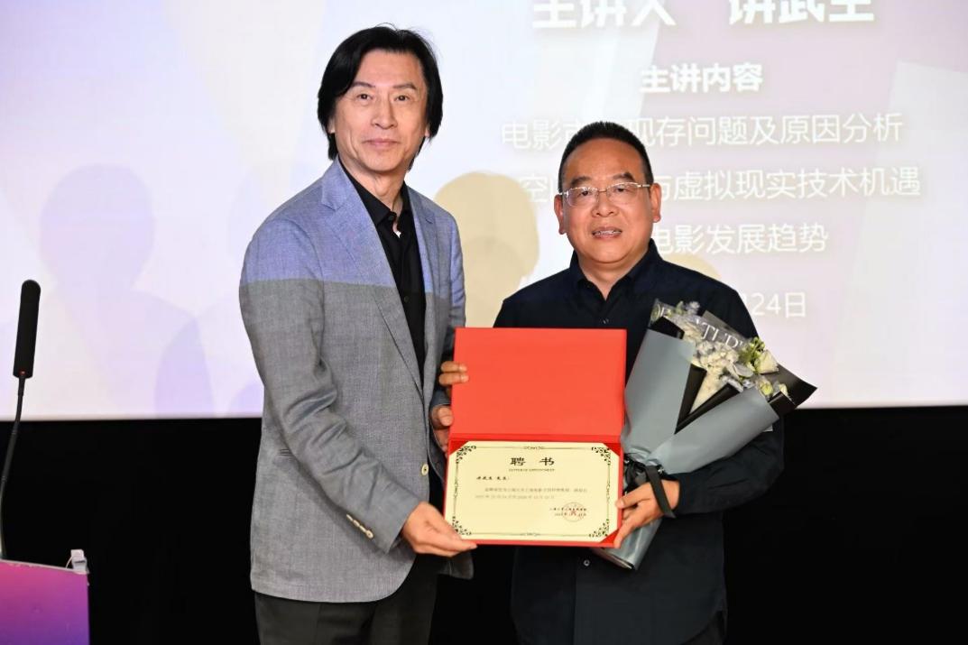 论坛前夕10月24日,上海电影学院举行特聘教授受聘仪式,百纳千成执行总裁、华美佰纳董事长讲武生正式入职。学院执行院长何小青为其颁发聘书时表示:”讲总不仅是中国电影产业化的实践者,更是技术革新的思考者。他将为学院带来最前沿的产业视角和实践经验,推动我们的教育体系与行业发展实现同频共振。” 讲武生董事长则承诺,将以 “产学研” 为核心,通过案例教学、项目实践等形式,培养大空间电影领域 “懂艺术、懂技术、会创作、知市场” 的复合型人才。