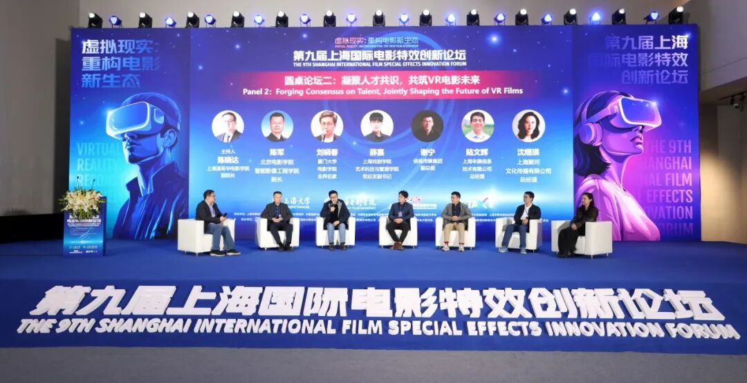 下午还举行了以“凝聚人才共识,共筑VR电影未来”主题为圆桌论坛。在上海温哥华电影学院副院长陈晓达主持下,北京电影学院智能影像工程学院院长陈军,厦门大学电影学院业界名家刘晓春,上海戏剧学院艺术科技与管理学院党总支副书记薛嘉,倍视传媒集团副总裁谢宁,上海申腾信息技术有限公司总经理陆文辉,上海聚珂文化传播有限公司总经理沈晅瑛围绕VR电影的人才培养路径、产学协同机制及未来产业生态构建等关键议题,展开了深入、多元的交流与探讨,共同为VR电影领域的可持续发展建言献策。