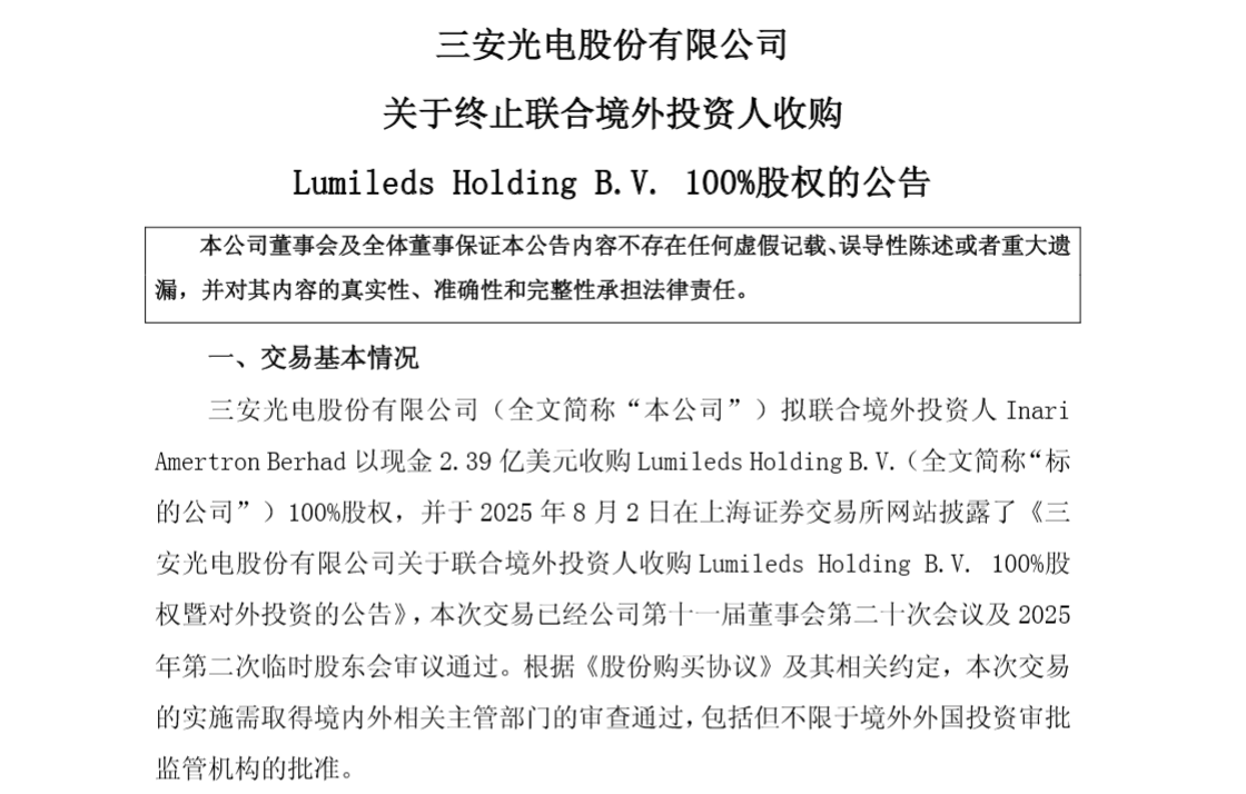 国内MicroLED芯片头部企业三安光电收购Lumileds Holding B.V.100%股权事项正式终止