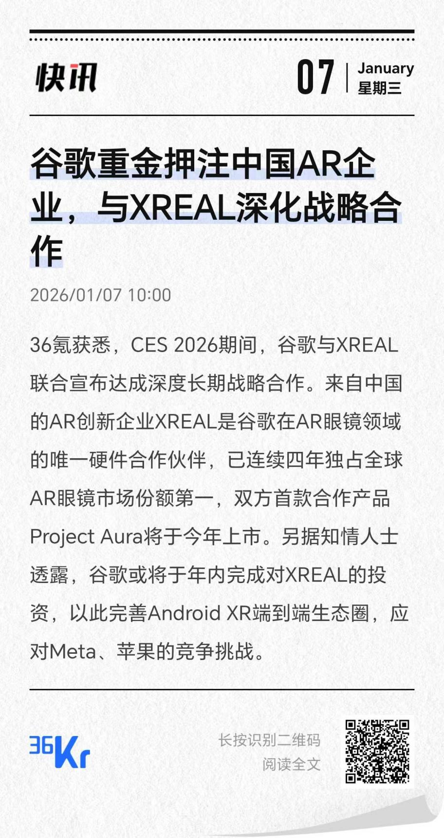 据36Kr报道,有知情人士透露谷歌计划年内完成对XREAL的投资,以此完善Android XR端到端生态圈,应对Meta、苹果的竞争挑战。
