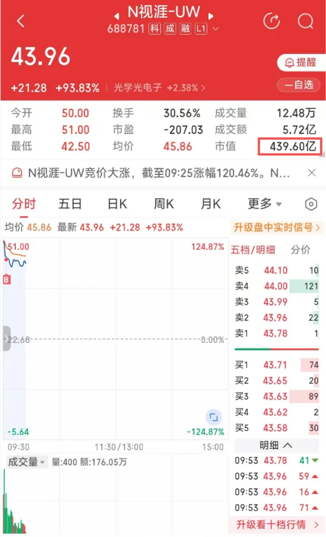 3 月 25 日 视涯科技股份有限公司(股票代码:688781,证券简称:N 视涯 - UW)今日正式登陆上交所科创板,开盘即迎来强势表现。截至早盘 9:53,公司股价报43.96 元,较发行价 22.68 元大涨93.83%,盘中最高触及 51.00 元,最低下探至 42.50 元,当前总市值达439.60 亿元。
