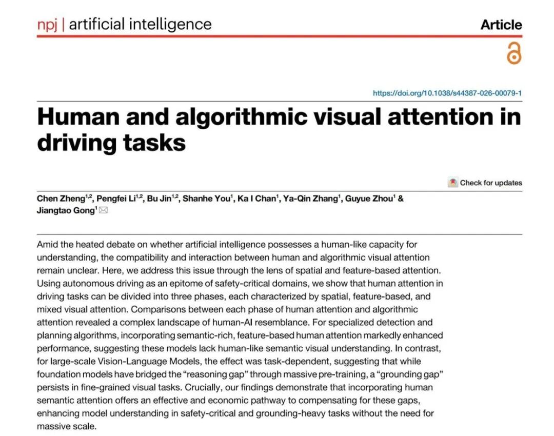 近日,清华大学智能产业研究院(AIR)团队在《npj Artificial Intelligence》上发表研究,首次系统揭示了人类与自动驾驶算法在视觉注意力上的本质差异。研究采用3×3×2混合实验设计,招募36名驾驶员(18名专家、18名新手),并借助七鑫易维aSee Pro眼动仪完成了关键的眼动数据采集。