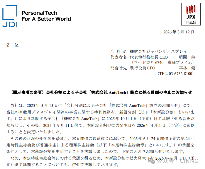 日本显示技术公司JDI终止分割设立子公司计划